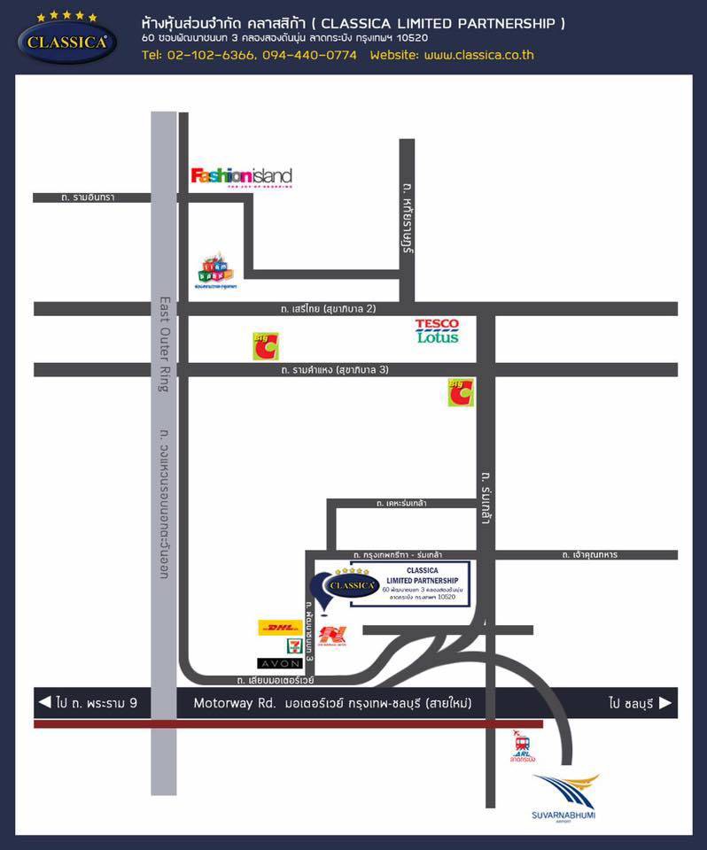| สถานที่ไป | ห้างหุ้นส่วนจำกัด คลาสสิก้า 60 ซ.พัฒนาชนบท 3 คลองสองต้นนุ่น ลาดกระบัง กรุงเทพฯ 10520 จังหวัด กรุงเทพมหานคร | ||